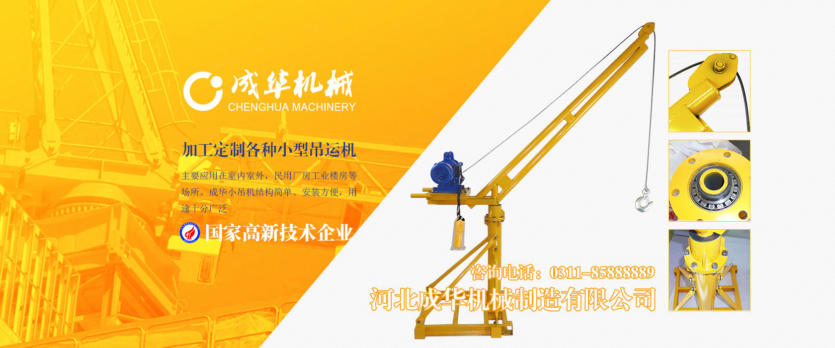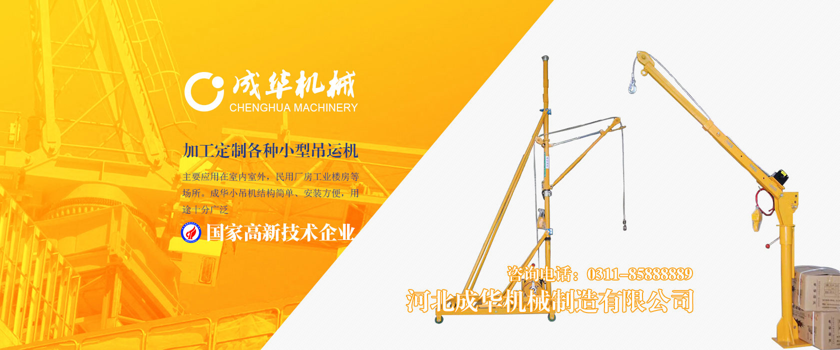 河北成華機械制造有限公司為國家高新技術企業(yè),旗下吊運機制造廠是家專業(yè)生產制造便攜式小吊機、手提式小吊機附屬工廠,我廠產品主要應用在室內室外,民用廠房工業(yè)樓房等場所。成華小吊機結構簡單、安裝方便,用途十分廣泛,小吊機產品被廣泛應用于機械制造、電子、汽車...